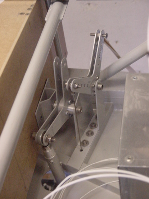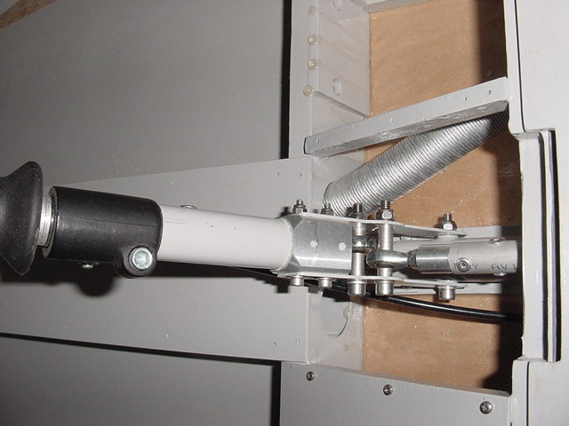 | The flaperon control lever is on a small angle with the centerline of the fuselage. On one side I put two extra washers between the bracket and the frame. Now it is possible to put your hand on the lever without touching the frame. | side view of the flaperon lever system |