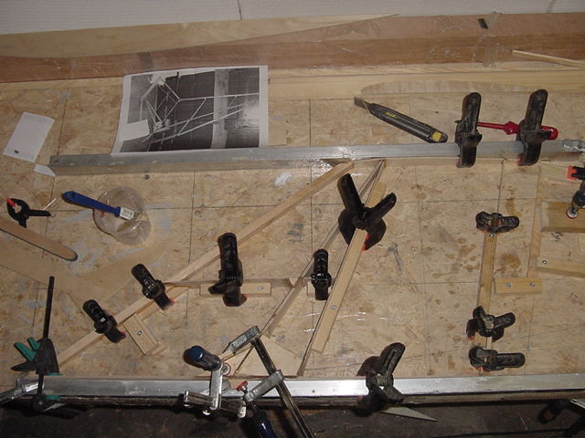 | 19-11-2006 My worktable is to small for the upper part I made a plywood extension for the table. Mainspar and ribs are positioned and glued. | 19-11-2006 De lower rib is positioned under a 30% angle to the table. |