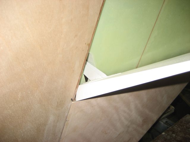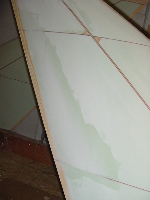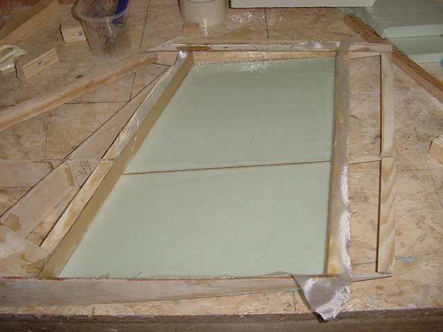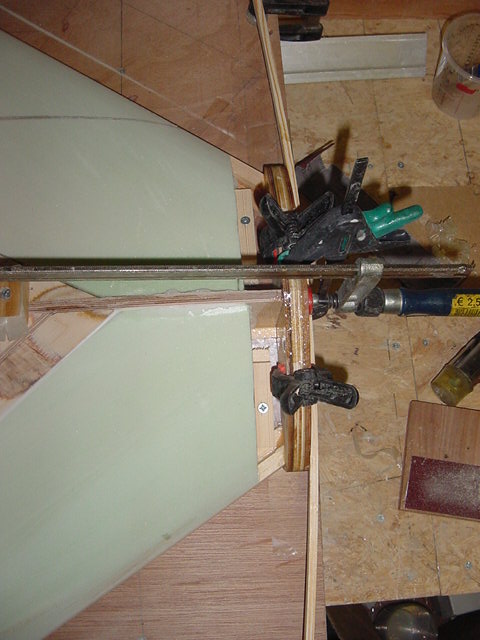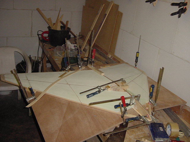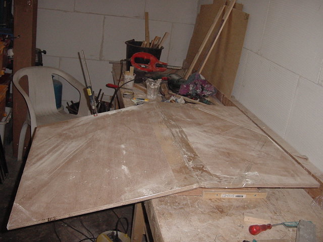 | 22-1-2007 Lower en upper part glued together on jig table. | 22-1-2007 Closer look on the jig table, 2 plywood sheet mounted on a 30% angle. |
