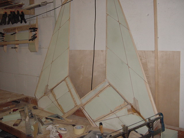 | 27-1-2007 Glueing front attachement block. | 10-2-2007 Both vertical stabilizers ready for covering |